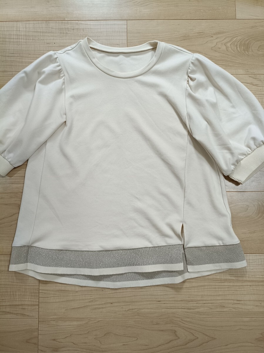> 美品 Bon Sens ボン・サンス★五分袖カットソー ストレッチポンチ ラメリブアクセント 袖がお洒落♪ 38 オフィスカジュアル 通勤通学