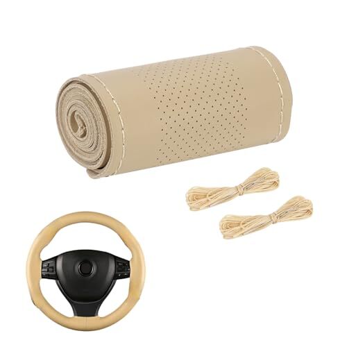 - ハンドルカバー ステアリングカバー 本革 編み込み 取付簡単 幅10.5cm 車 滑りにくい ぴったり ベージュ×ベージュ糸