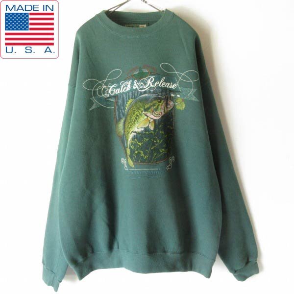 > 90s USA製 魚 釣りプリント スウェット 緑系 XL ブラックバス Thompson トレーナー 大きいサイズ アメリカ製 ビンテージ D150-13-0010Z