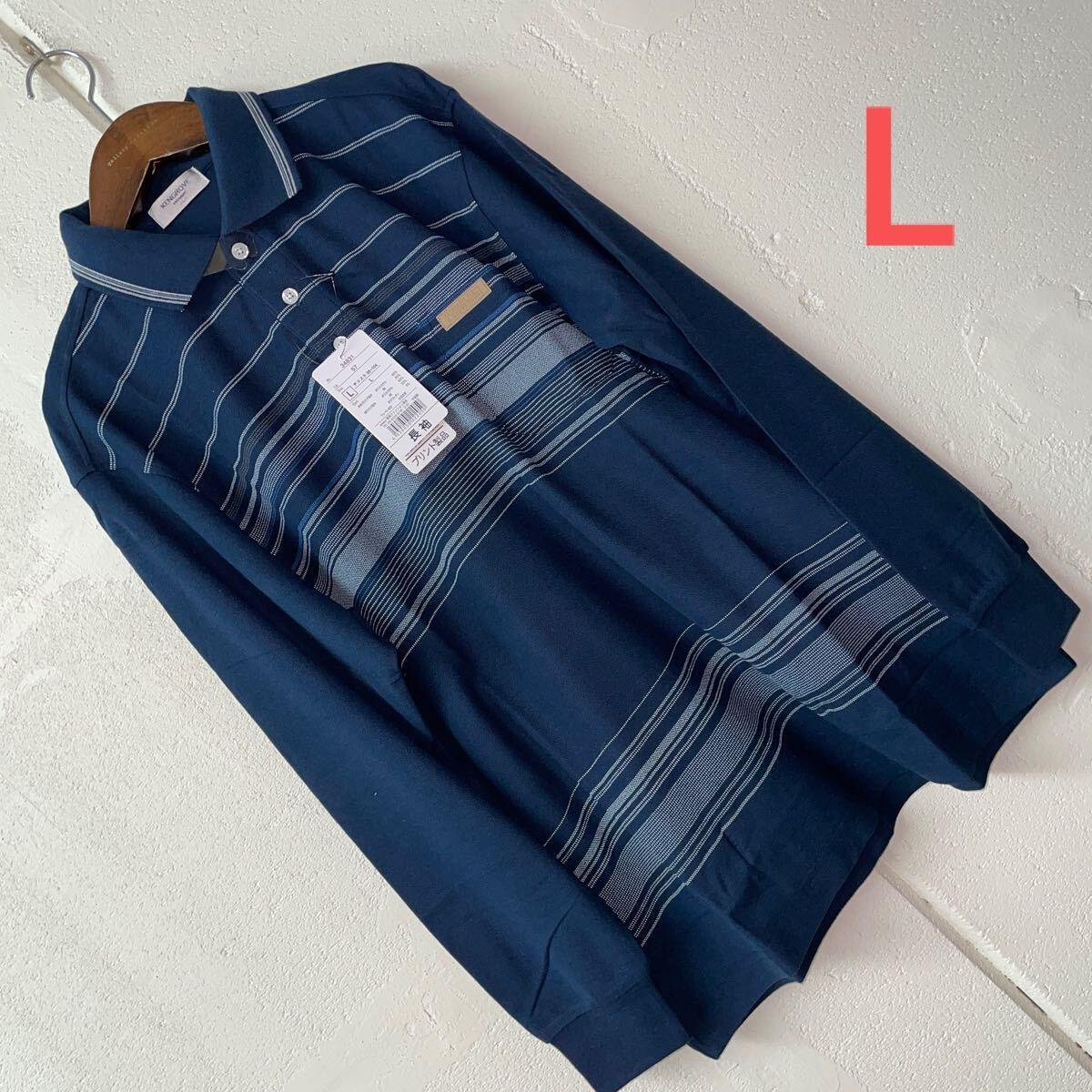 - Lサイズメンズ胸ポケット長袖ポロシャツネイビー