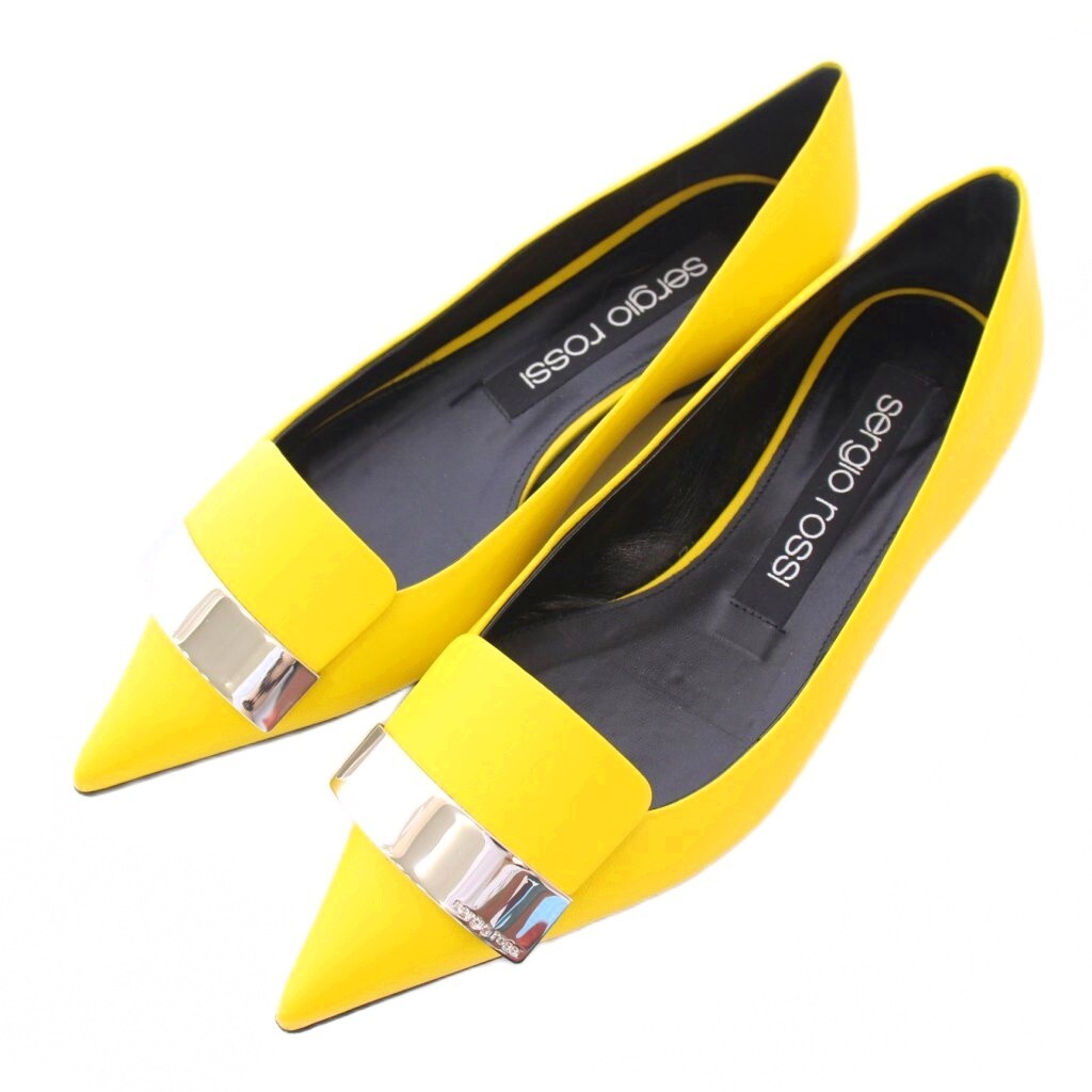 - セルジオロッシ Sergio rossi SR1 フラットパンプス ポインテッドトゥ ローヒール レザー ロゴプレート 37 黄色 イエロー A78960