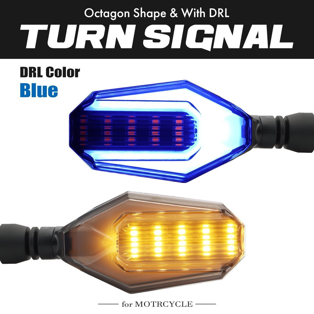 - バイク汎用 LEDウインカー ブルー デイライト付き オクタゴン(八角形)デザイン スモークレンズ 2個セット DRL FZ319-B