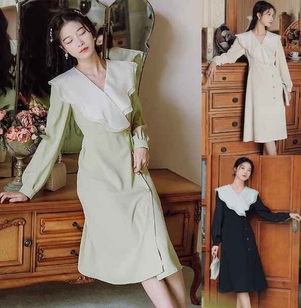 - 全3色 長袖ワンピース フリル 切り替え スリム 着痩せ sweet系 S ライトグリーン