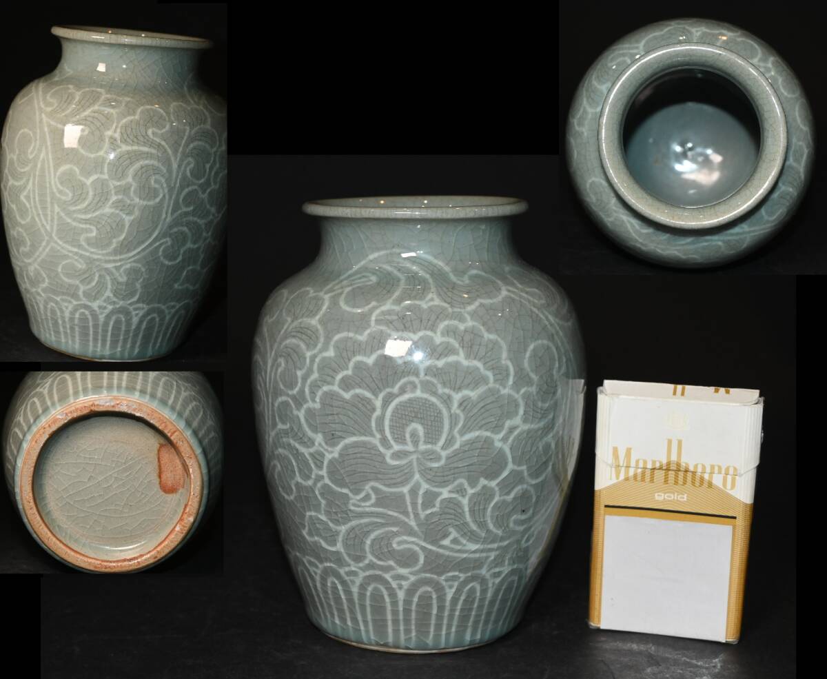 - 朝鮮美術 高麗青磁 象嵌 花紋 壷 高約15.7cm 青磁壷 壺 花文 古玩 古美術 検:三和高麗 漢陽高麗 朝鮮古陶 海市商会