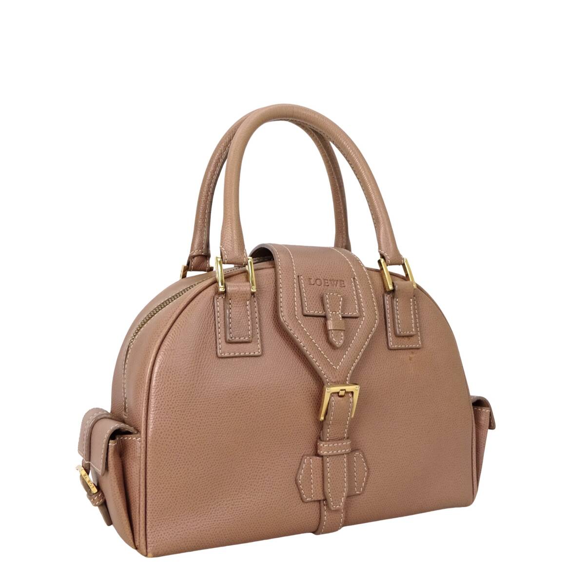 > 本物 良品■ロエベ■ボーリング ミニボストン ベージュブラウン レザー ゴールド 底鋲 ハンドバッグ ミニトートバッグ