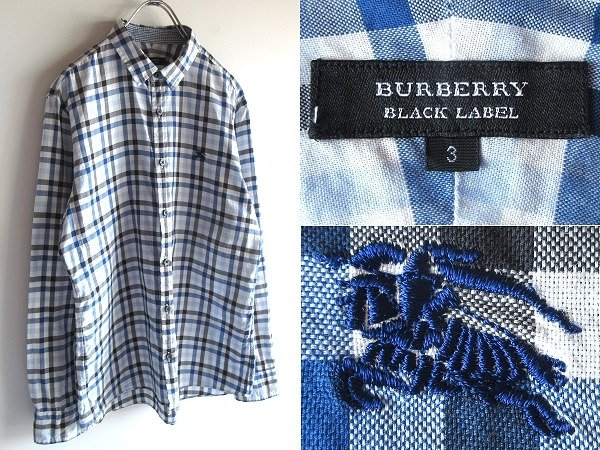 > 希少 BURBERRY BLACK LABEL バーバリーブラックレーベル ホースロゴ刺繍 袖裏ギンガムチェック コットン チェックシャツ 3 青黒白 三陽商会