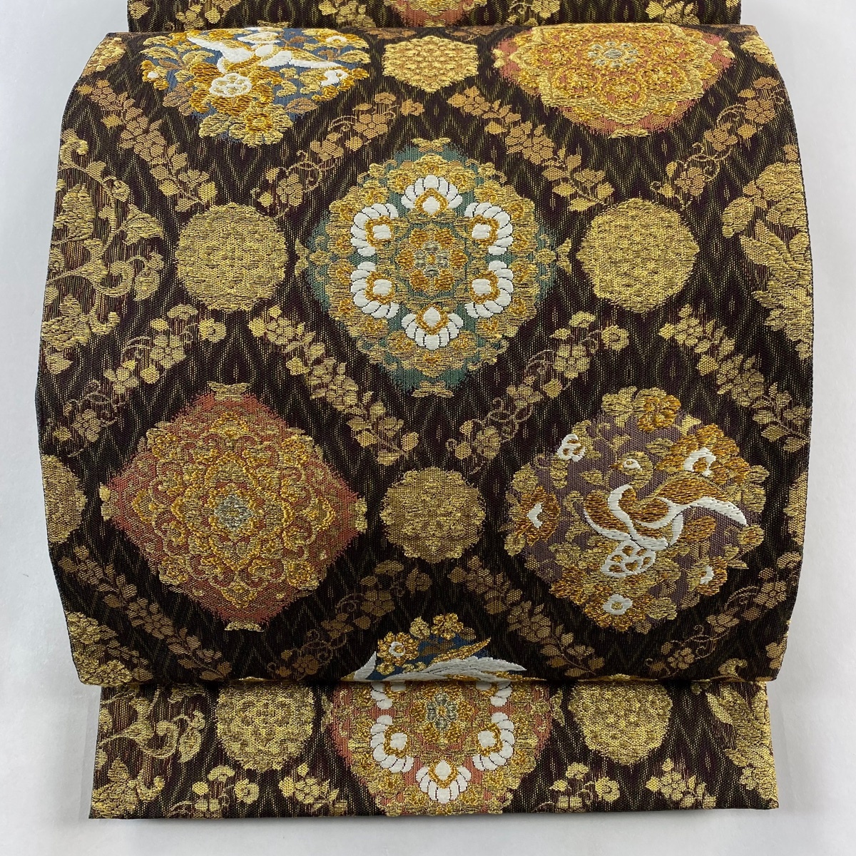 - 袋帯 美品 名品 紗綾経錦 菱取割付紋様 華文 花喰い鳥 金糸 箔 焦茶色 六通 正絹 【中古】