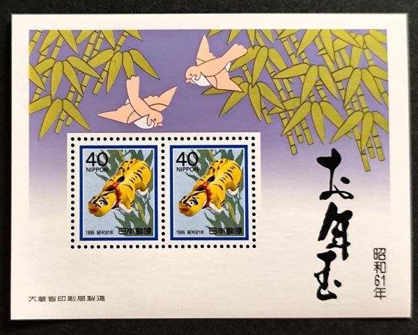 > [25090601] 年賀切手【お年玉小型シート 昭和61年用】虎「神農の虎」40円×2 1986年発行 美品