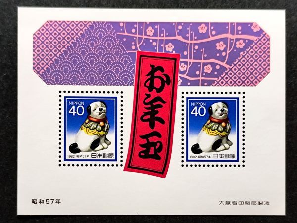 > [25090608] 年賀切手【お年玉小型シート 昭和57年】 戌・いぬ「犬」相良人形 40円×2 1982年発行 美品