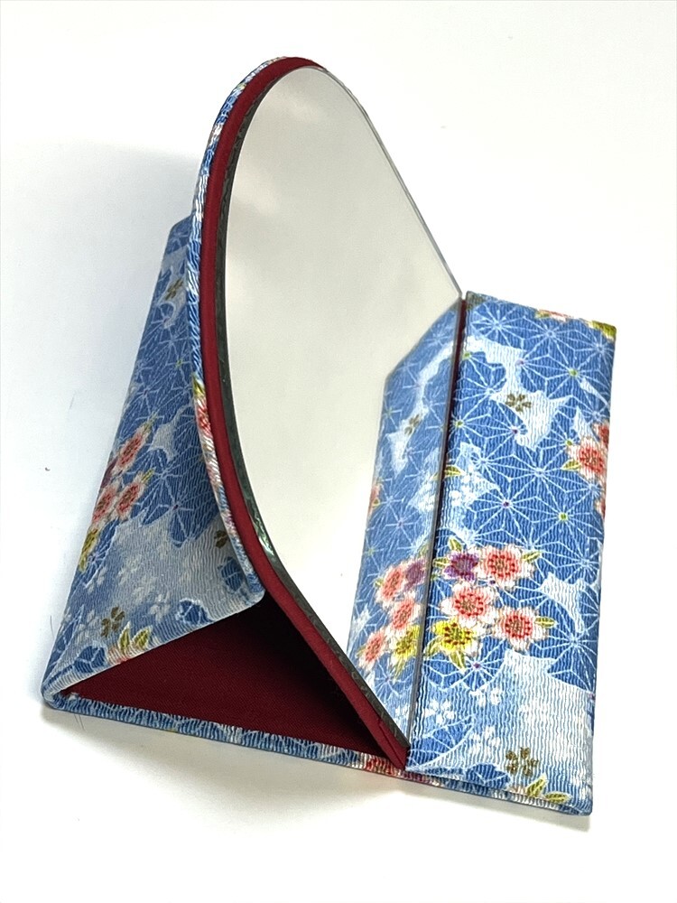 - 花とら●リサイクル和装小物 和柄 ちりめん 鏡 折りたたみ鏡 携帯用 自立型鏡 未使用品 超美品 250817