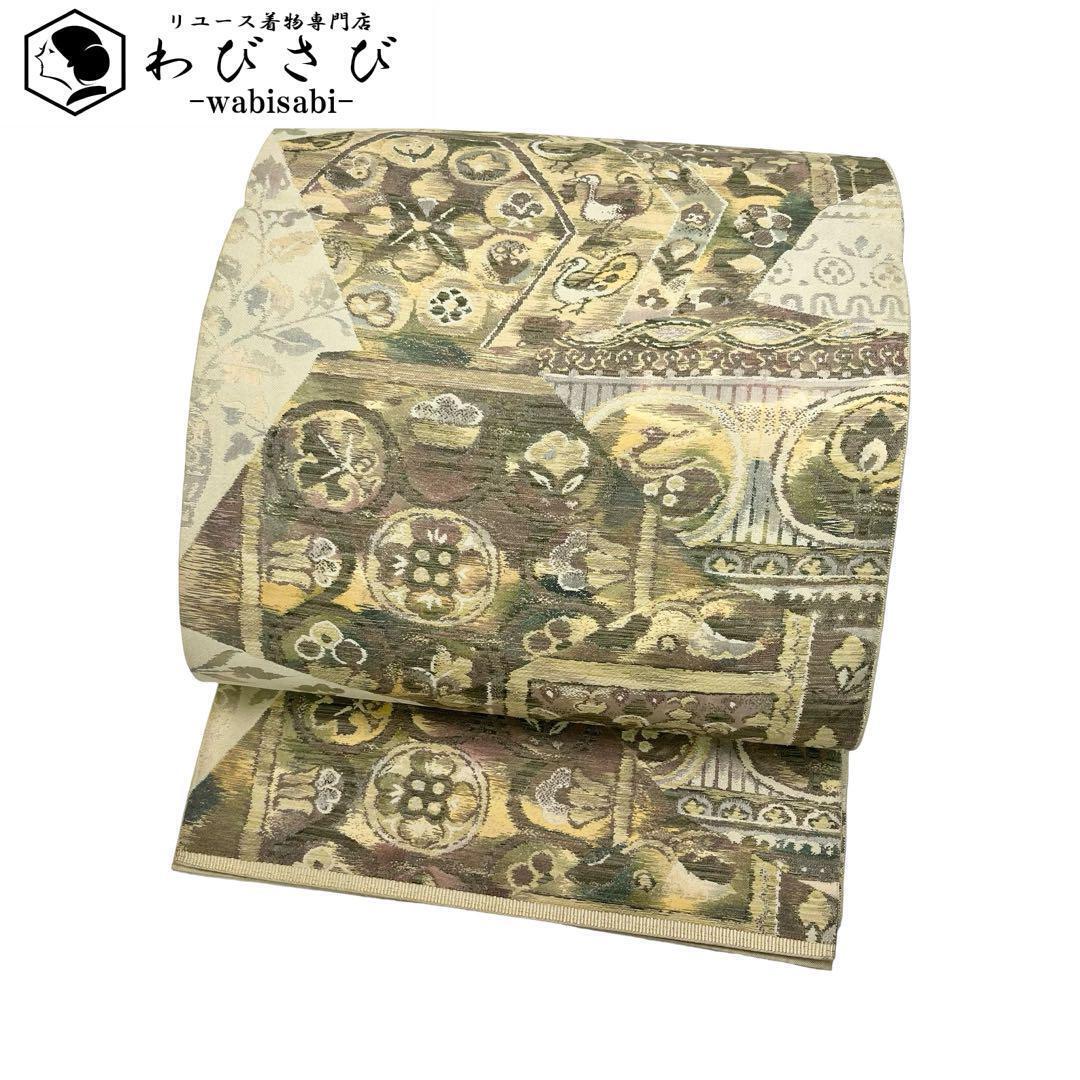 > 袋帯 抽象花鳥模様 紬 牙黄色 O-4077 着物 きもの kimono 和服 和装 中古 リサイクル着物 【送料無料】