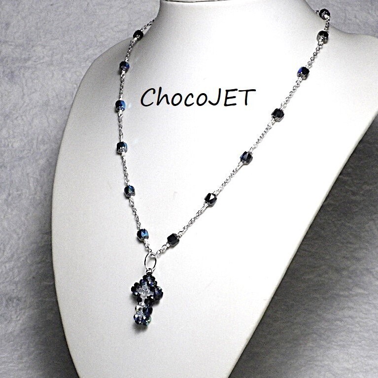 - チェコビーズ・クロスネックレス ブラックオーロラ・クリスタルビーズ 黒色
