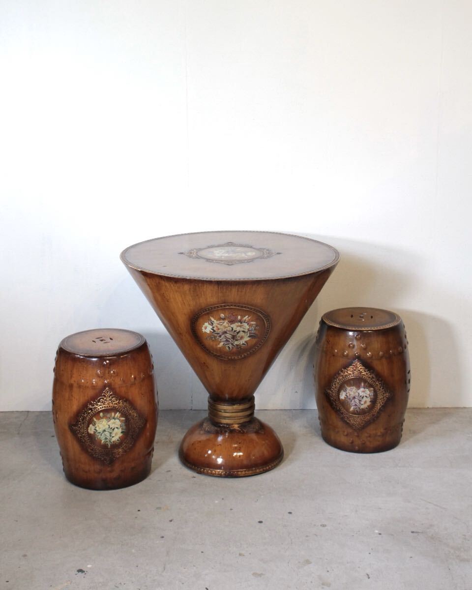 - 【3点セット】アジアンな木製テーブル 陶製スツール エレガント クラシカル 民族 中華 インテリア エスニック 陶器 ダイニングセット 13893