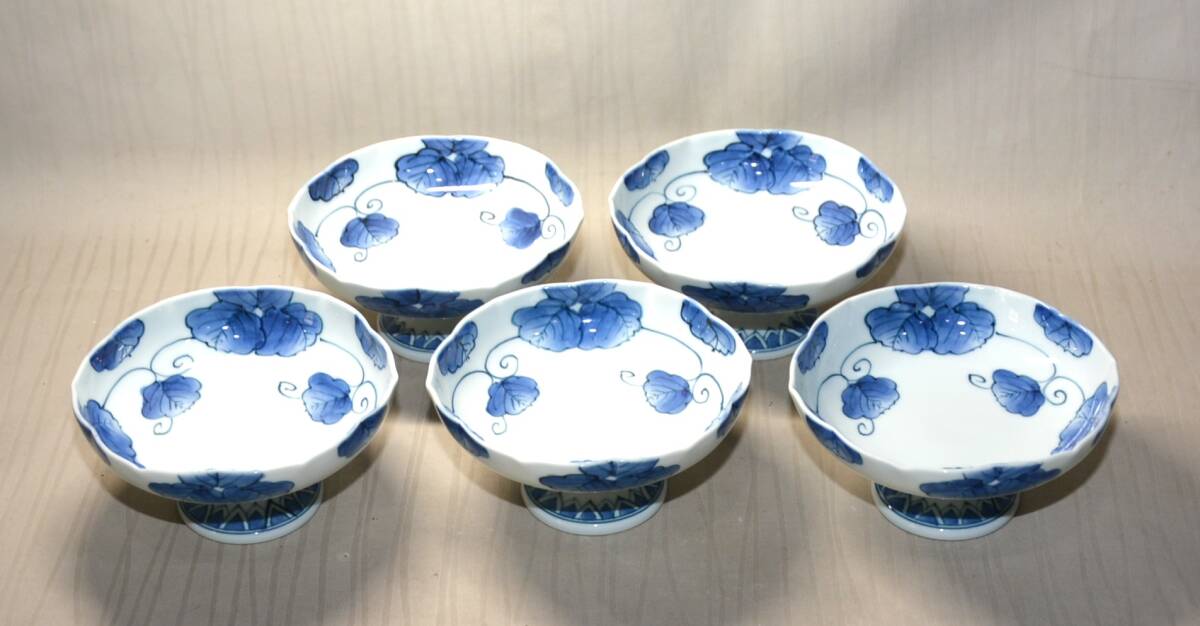 > 26◆初荷です ◆平戸焼 三川内焼 啓祥窯 染付蔦絵高台向付 5客 13.3cm ◆料理に使いやすいサイズです 高級和食器 懐石