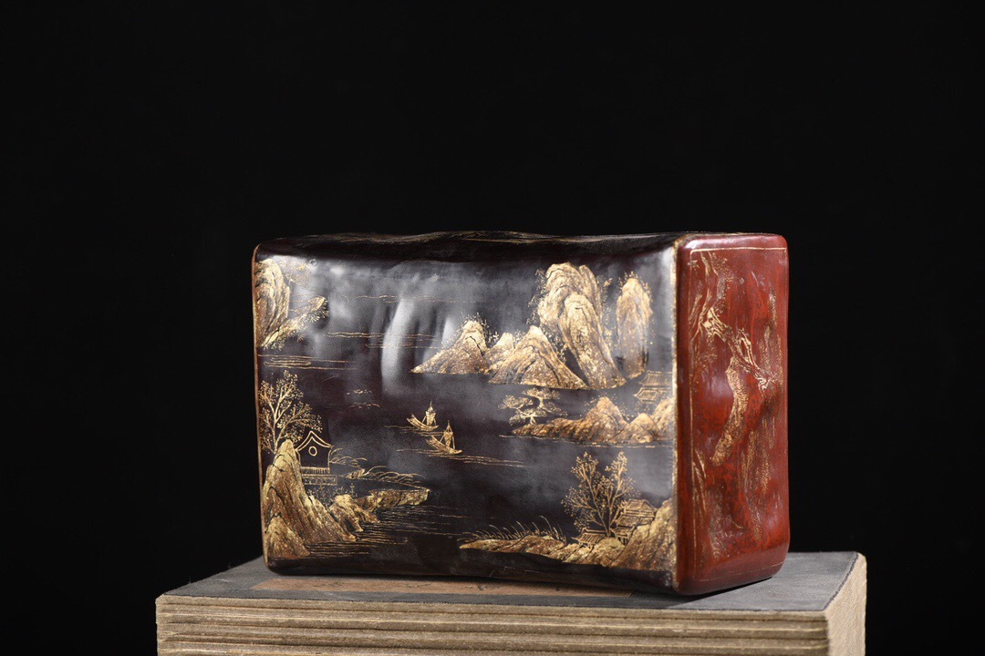 - 蔵友旧蔵出 木胎漆器彫 描真金 山水図 高枕無憂 枕頭 供養品 置物擺件 古賞物 中国古玩 中国古美術品