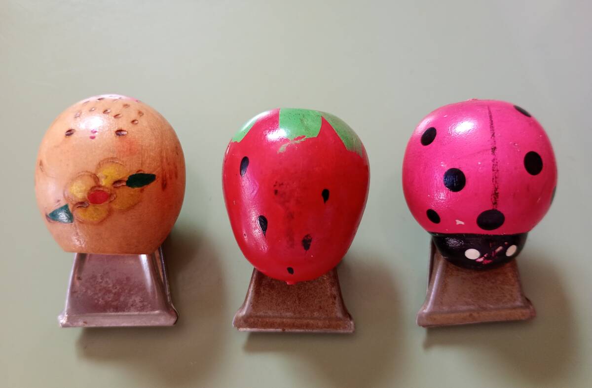 - 昭和レトロ イチゴ てんとう虫 こけし風女の子 クリップ 3種3個 木製 日本製 レトロポップ ファンシー雑貨
