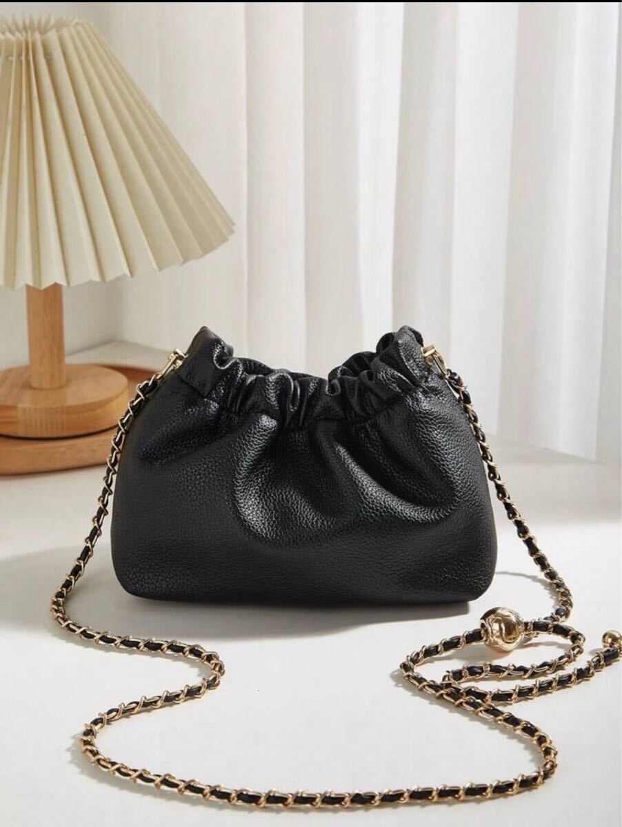 - ブラック 巾着型 ショルダーバッグ 黒 ミニ チェーン 長さ調整 マチあり