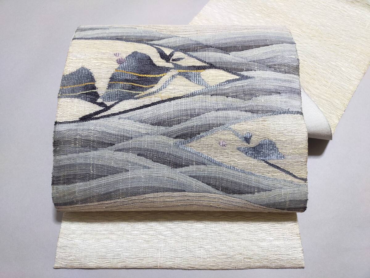 - FB13 袋帯 正絹 お太鼓柄 すくい織 波鳥文 幾何学 長4m60cm
