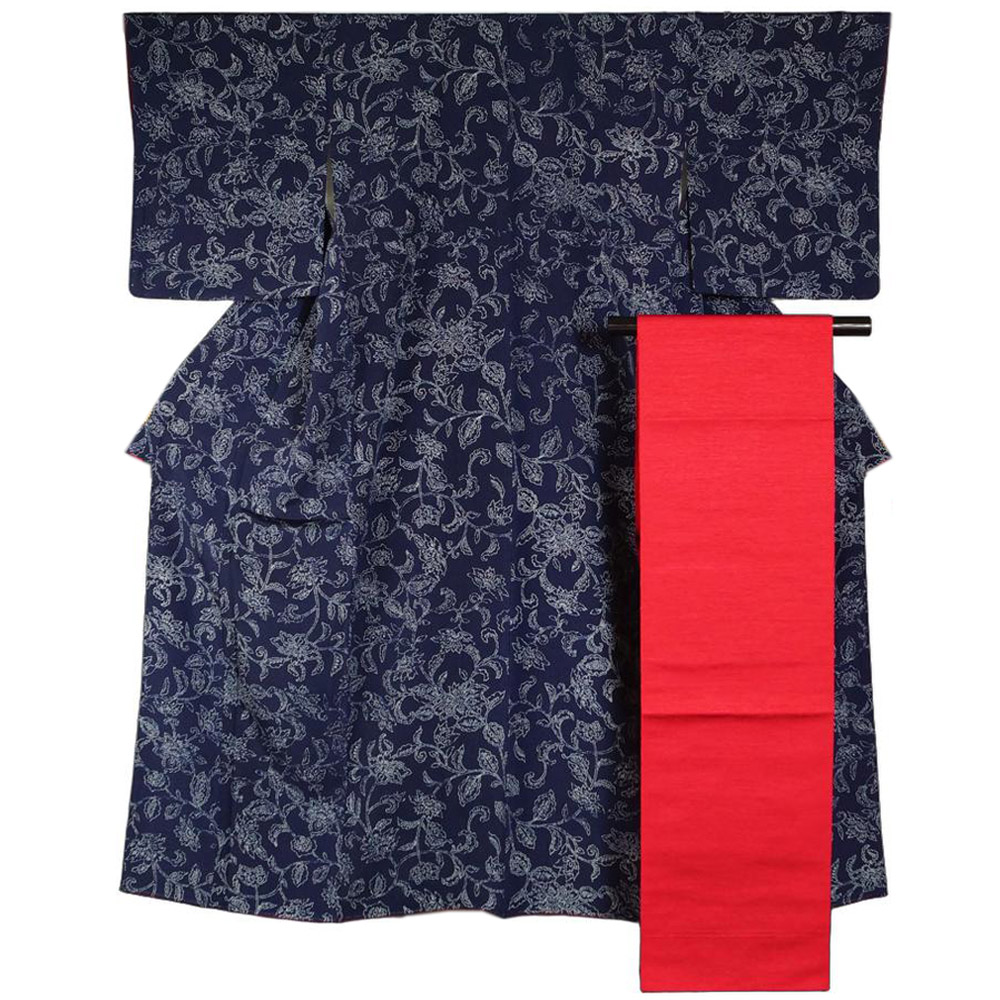 - 着物セット 未使用品 藍染 小紋・八寸名古屋帯 2点 セット 唐花模様 Sサイズ 藍染め 中古 リサイクル小紋 リサイクル着物 天陽