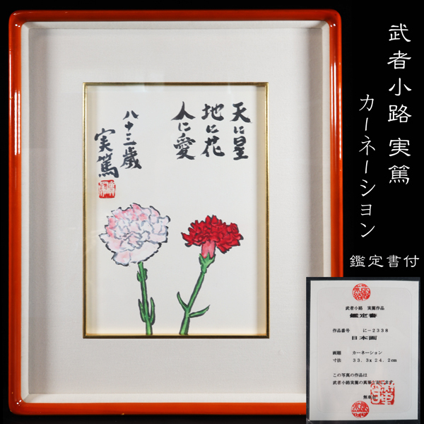 > ◇雅◇ 真作保証 武者小路実篤 「カーネーション」 色紙 肉筆 日本画 落款 印 直筆サイン 無車会鑑定書付 額装 /RYO.25.9 [A141] PO