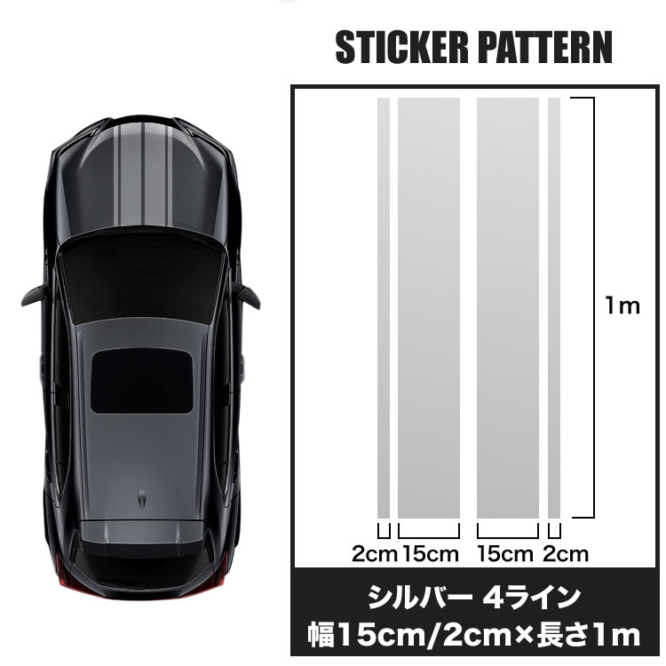 - 自動車用 ボンネット ストライプ ライン ステッカー シルバー 1m 幅15cm+2cm 4本線 リアゲート ルーフ デカール シール