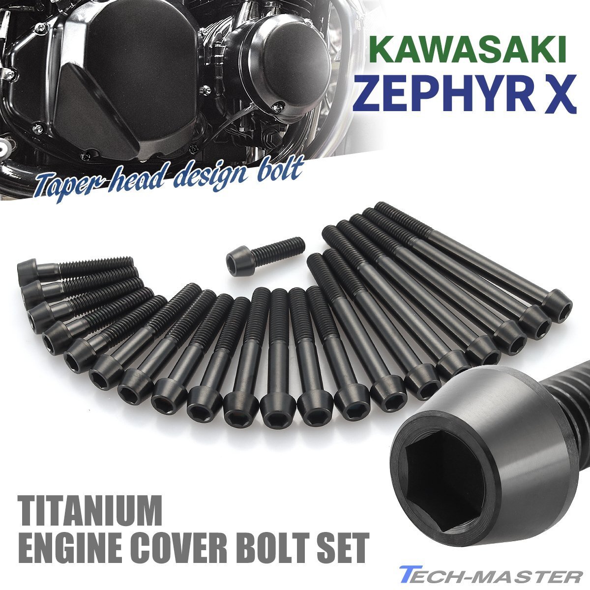 > ゼファーχ カイ エンジンカバーボルト 21本セット チタン製 テーパーヘッド カワサキ車用 ブラック JA8136