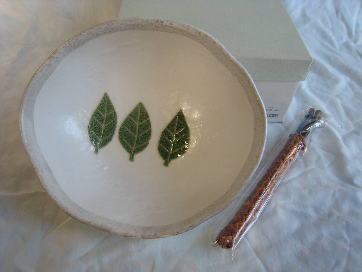 - ★未使用・保管品★金田千瀬「織部木の葉」/木の葉柄 サラダ~盛鉢 箸付き/美濃焼 山作窯