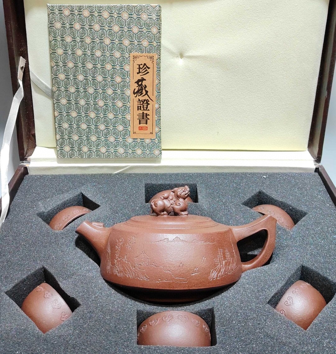 - 蔵友旧蔵出 紫砂壺 瑞獣套壺 顧景舟款 原礦老紫泥 茶杯六點同出 箱付 茶道品 煎茶道具 文房賞物 希少珍品 中国古玩 中国古美術品