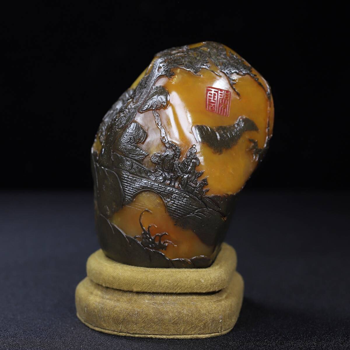 - 【超珍館蔵】寿山石 烏鴉皮 田黄石 細密彫 山水人物紋印章 印章 印鑒 文房具 書道品 古賞物 古董品 古美術品 時代物 旧家蔵出 稀少珍蔵品