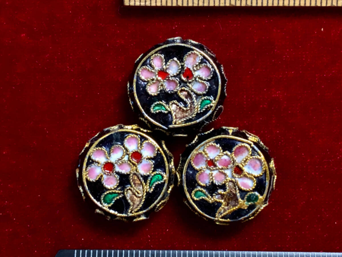 > ¶!¶ 有線七宝焼ワールド - 3個の円盤型大玉で1単位 ¶!¶ 約6㎜×Φ18.5㎜円盤型 金線に黒釉ピンク花 手作 手芸 工芸 インテリア 趣味