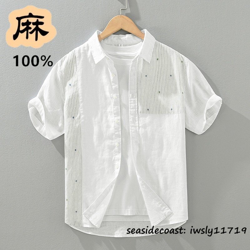 - 夏新品★特売 リネンシャツ 半袖シャツ メンズシャツ 切替 ストライプ柄 麻100% サマーシャツ 清涼感 涼しい 心地良し 快適 ホワイト XL