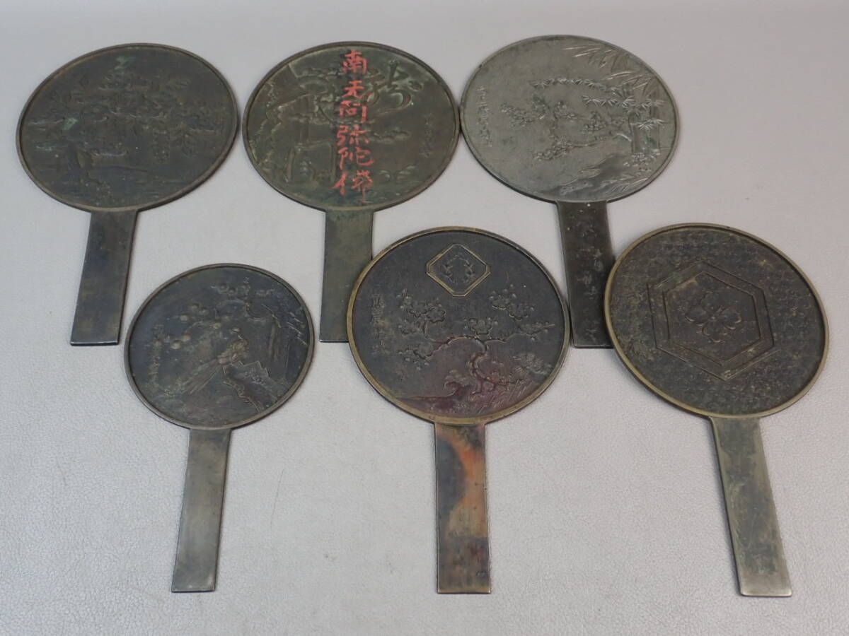 - 【骨董・化粧道具】★古い 唐金製 古銅製 在銘★★古鏡 6点 まとめて go049vb 柄鏡 手鏡 和鏡 古民芸