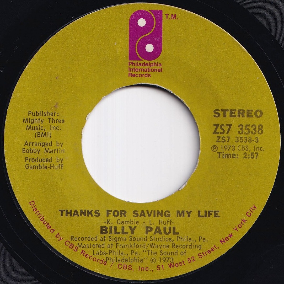 > Billy Paul Thanks For Saving My Life Philadelphia International US ZS7 3538 212340 SOUL ソウル レコード 7インチ 45