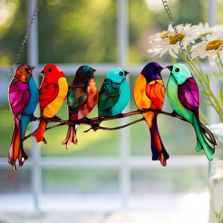 - カラフルな5羽の小鳥のステンドグラス風サンキャッチャー 新品 未使用品