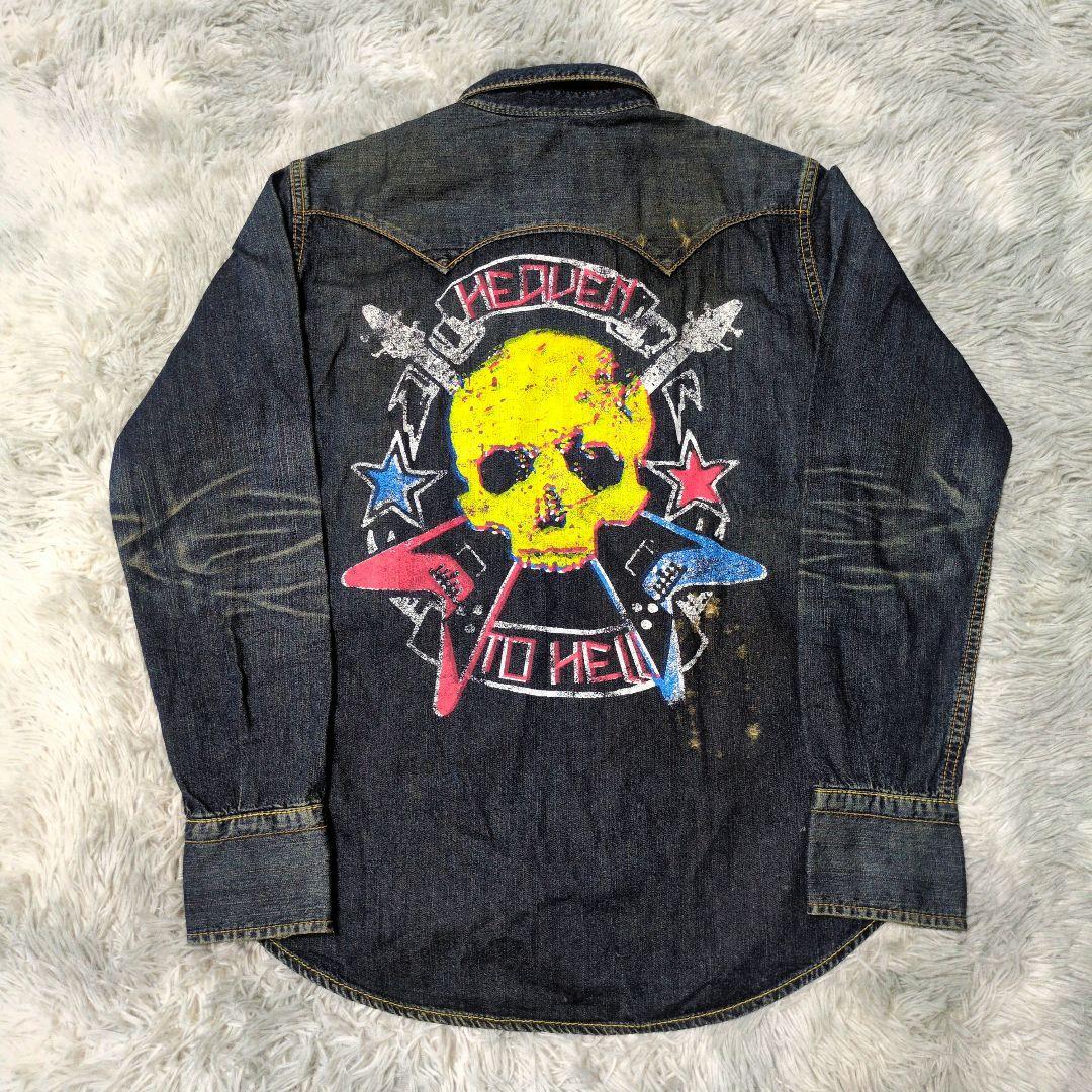 > 【EDWIN】535601☆バックプリント デニムシャツ☆ウエスタンシャツ☆L☆ヴィンテージ加工☆ダメージ加工☆ダンガリーシャツ☆エドウィン