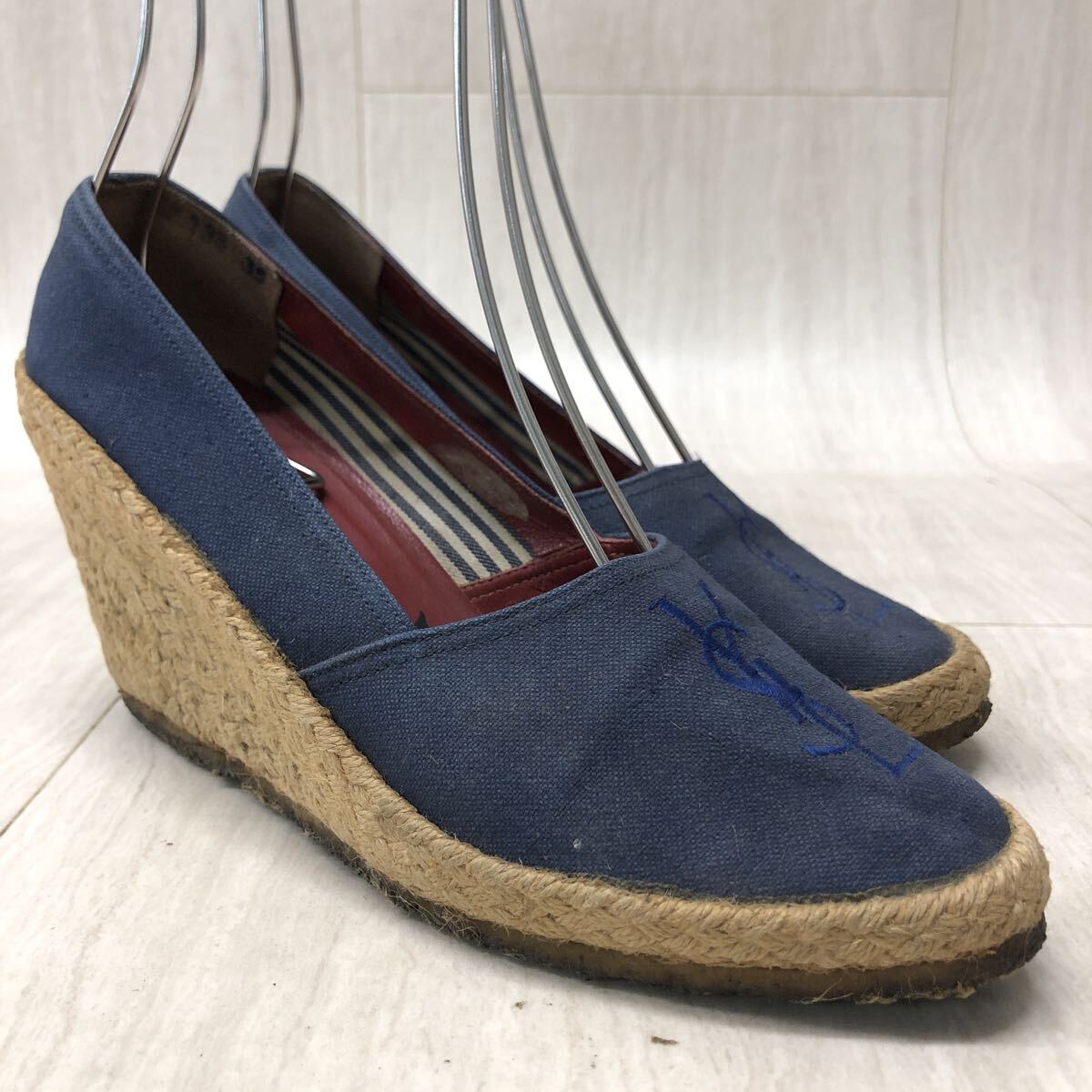 > M285 FN-250829-64 YVES SAINT LAURENT イヴ・サンローラン コットンラタンウエッジソールシューズ パンプス レディース 35 ネイビー