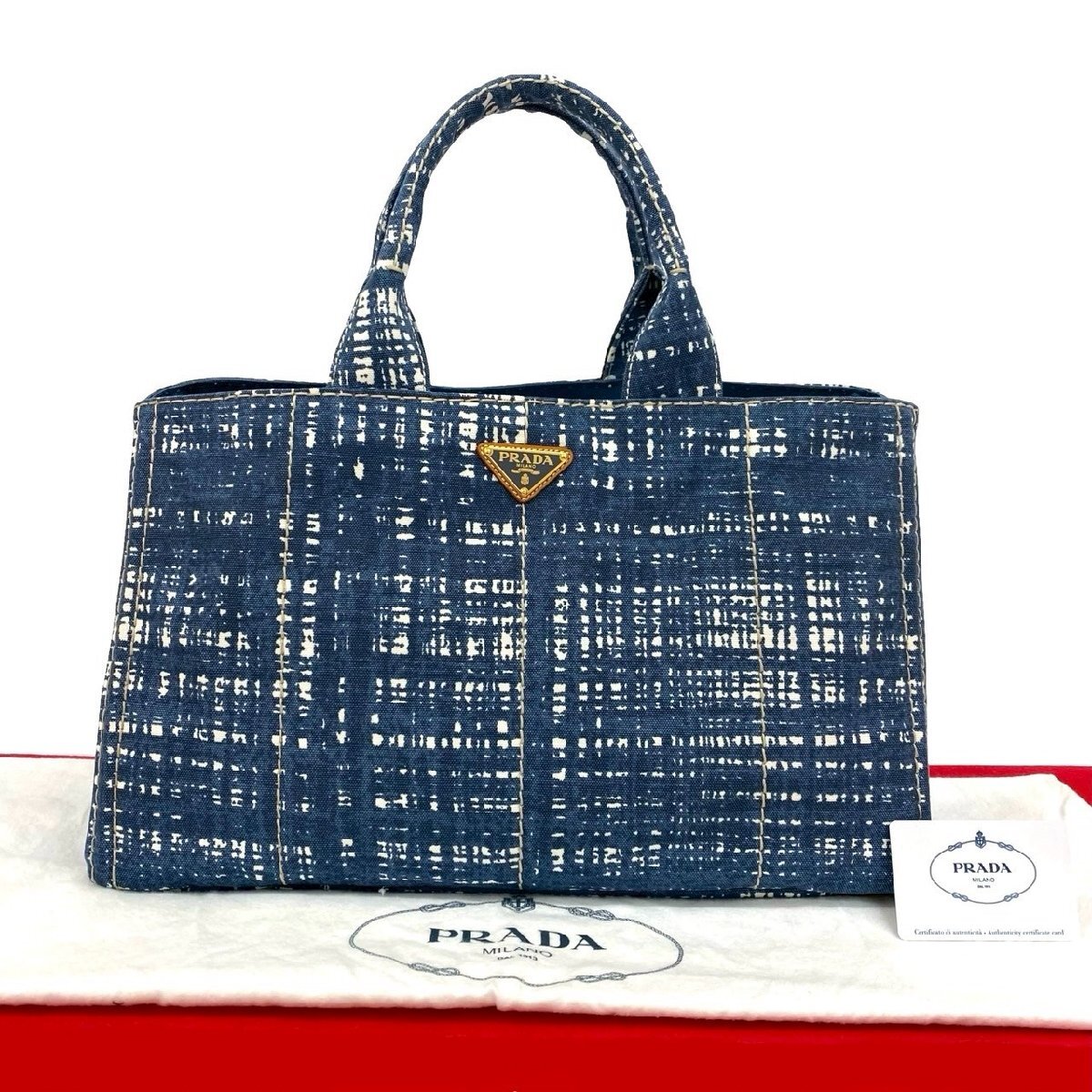 - 極 美品 袋 カード付 PRADA プラダ カナパ 三角ロゴ プレート 金具 デニム 柄 キャンバス ハンドバッグ トートバッグ ブルー 66157