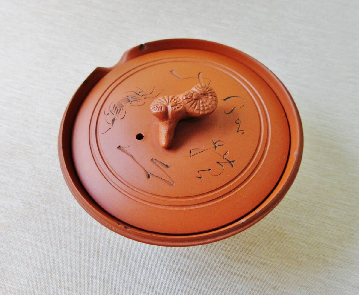 - 昭和レトロ常滑朱泥絞出し【月光 作】二代山田常山の彫り師 摘み霊芝、文字(千里横行)蟹5匹彫 箱無し