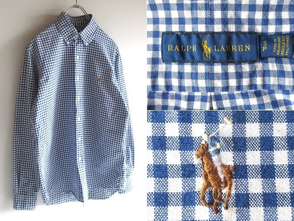 - ネコポス対応 RALPH LAUREN ラルフローレン ポロポニーロゴ刺繍 コットン ギンガムチェック オックスフォード BDシャツ S ブルー ホワイト