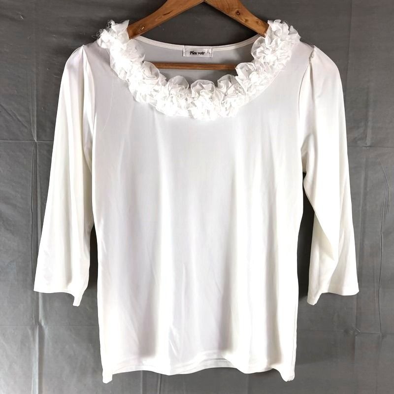 - プルヴワ pleu voir カットソー 7分袖 シフォン装飾 花 ストレッチ ホワイト Lサイズ 2025082800087