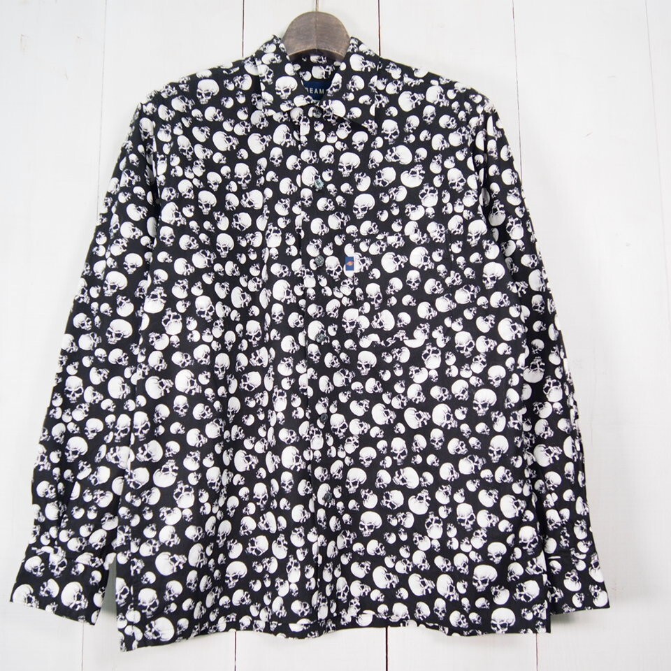 - ビームス BEAMS スカル総柄長袖コットンシャツ 柄シャツ 胸ポケット(M)ブラック