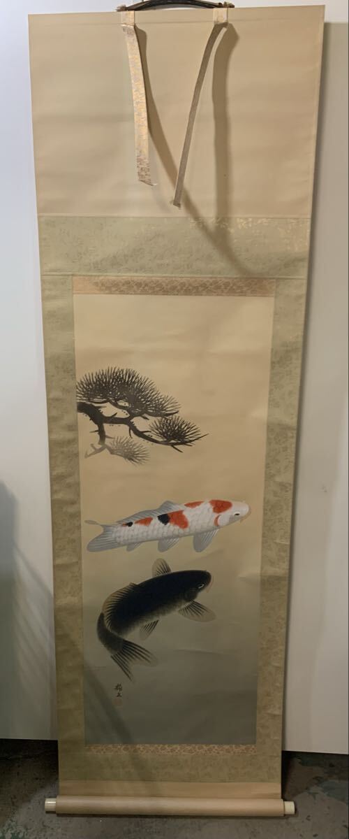 - E442R◆シミ有り◆掛け軸 掛軸 遊鯉 骨董 林静丘 美術品 真筆証明書有 約170cm