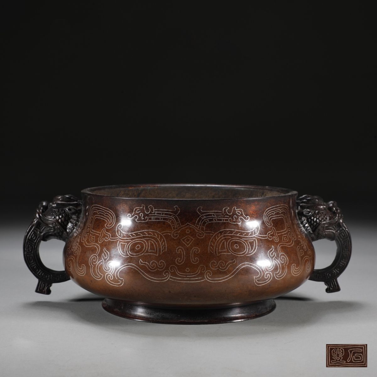 - 永し 明時代 石叟銘 古銅錯銀絲 饕餮紋龍耳爐 極細工 古銅彫 置物擺件 古美術品 時代物 古董品 収集 古美味 旧家蔵出 中国唐物 A8231