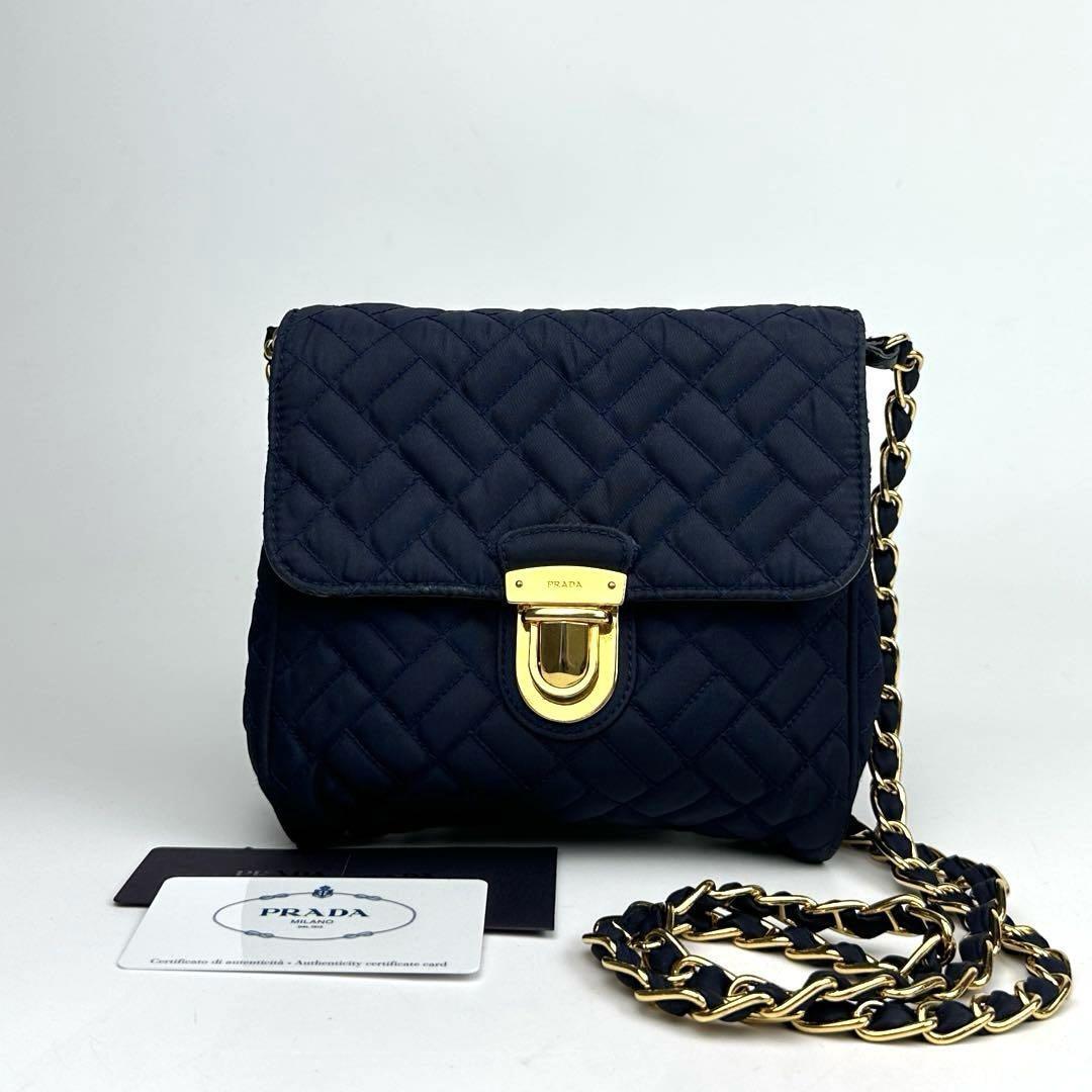 - 【美品】PRADA プラダ ショルダーバッグ 2way チェーン キルティング 白タグ 裏地総柄 斜め掛け ナイロンキャンバス レザー 紺色 ネイビー