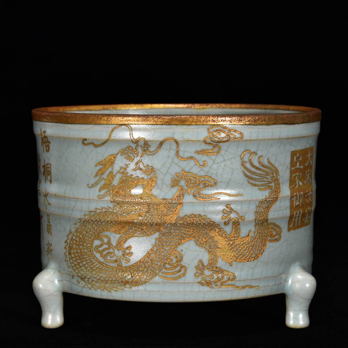 > 9_ZZ9010【惠】人間国宝 中国骨董 陶芸 磁器【宋汝窯包口銘文金刻竜紋持参金】工芸品 施釉陶 青花磁 陶芸 置物 收藏品