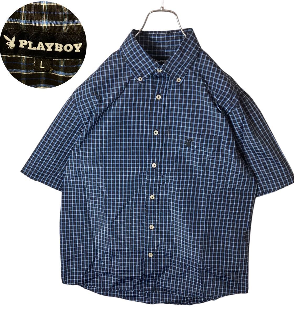 - PLAY BOYプレイボーイブルー系マルチカラーチェックシャツ刺繍ロゴLサイズ