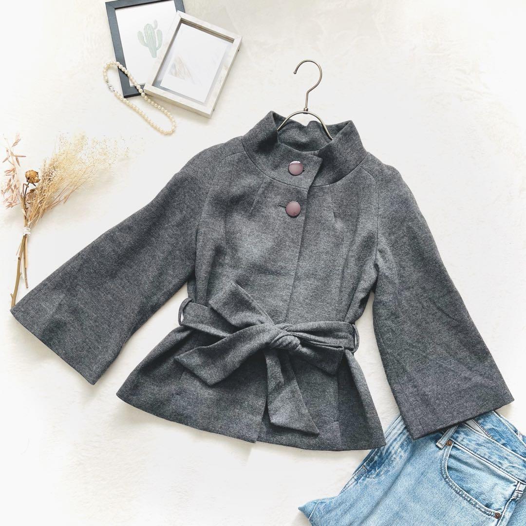 - INED】ハイネックハーフコート ボリューム袖 グレー リボン 日本製 9号