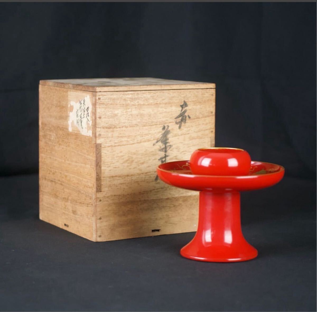 - 木製朱塗 金縁 唐草蒔絵 茶基 天目台 高台茶托 煎茶道具 茶道具 F359