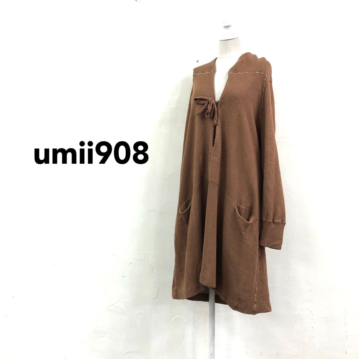 > 2K1739-G◆ umi908 ウミキュウゼロハチ ロングスウェットフーディ ワンピース Aライン キーネック 袖口リブ ポケット ◆ size0 ブラウン 綿
