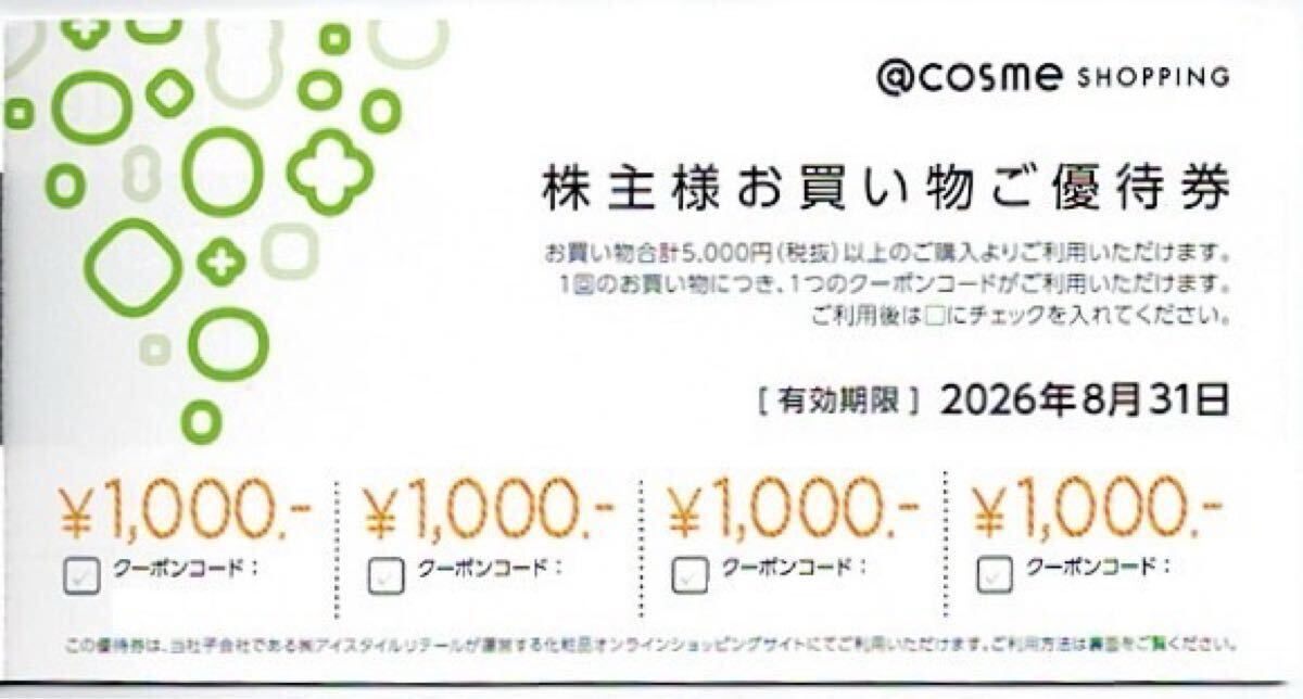 - 最新★送料無料★アイスタイル 株主優待 @COSME お買い物ご優待券 1000円割引券 1コード 複数あり 2026年8月31日まで コード通知